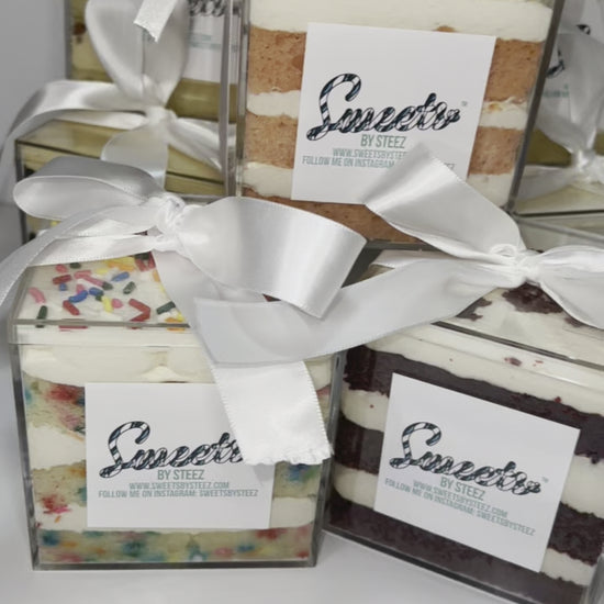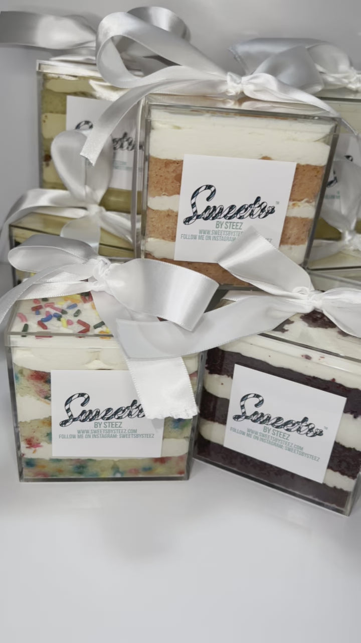 Our generously sized 3.3” layered cake cubes are handcrafted and presented in sleek acrylic keepsake boxes, designed to make a refined statement for weddings, bridal showers, baby showers, birthdays, corporate gifting, and indulgent personal moments. Each cube delivers multiple decadent bites of rich cake and smooth buttercream, layered to perfection for bold flavor and polished presentation in every detail.